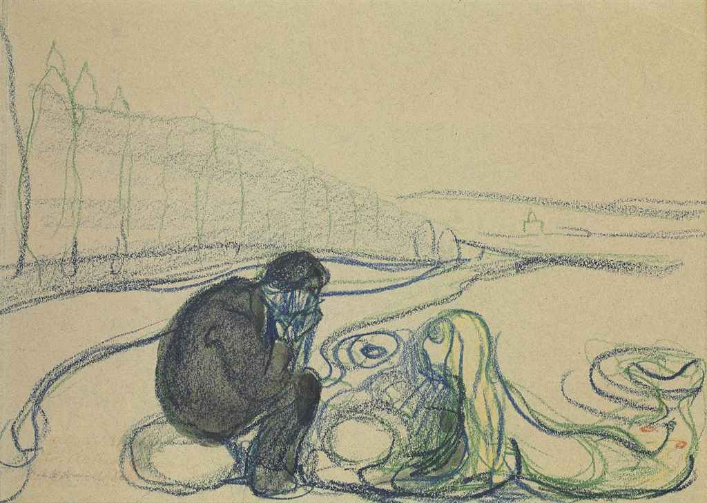 Edvard Munch (Norwegian, 1863-1945), Melancholy Man and Mermaid (Encounter on the Beach), c.1896-1902. Pastel and wash on paper, 25.3 x 34 cm.