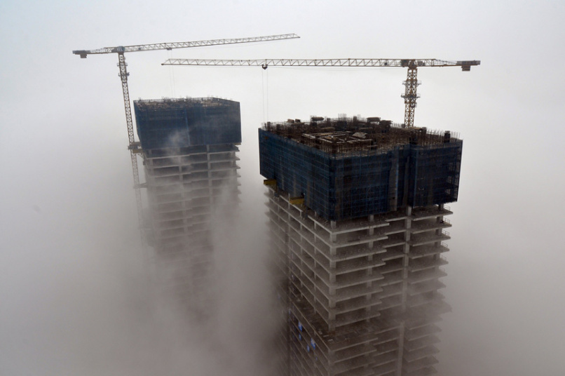 Buildings under construction are seen among fog in Rizhao, Shandong province, China