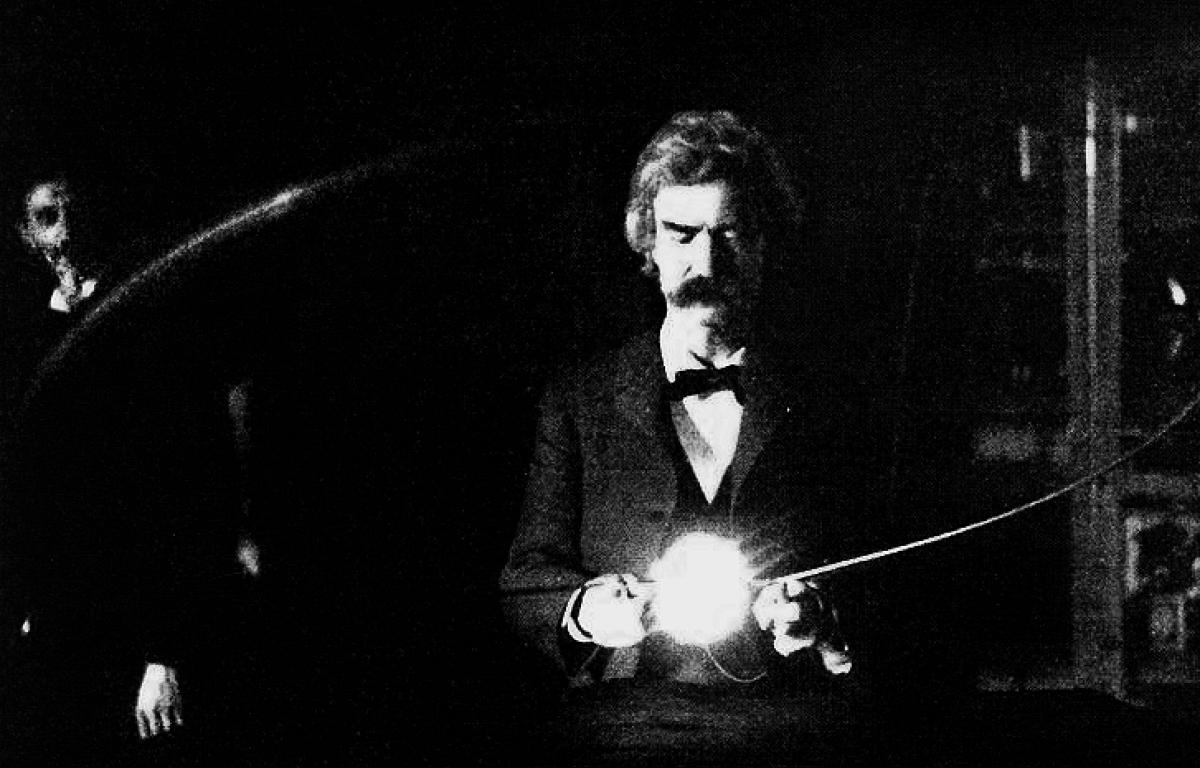 Above: Mark Twain in Tesla’s Laboratory at 35 South Fifth Avenue,