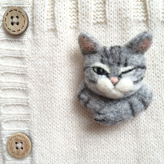 Winking cat needle felt brooch by CatsX